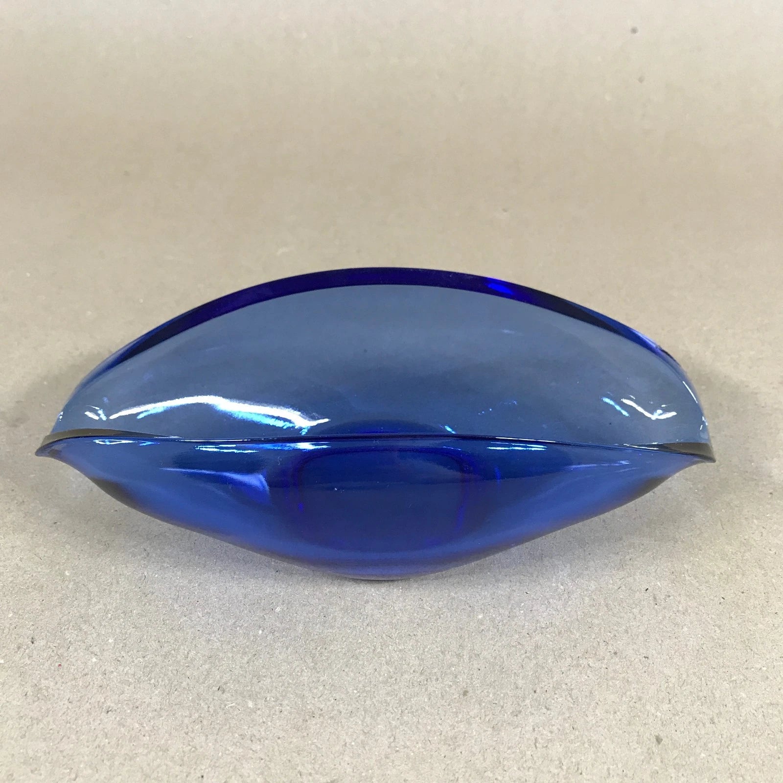 This elegant elongated blue glass bowl reflects the calm rhythm of the ocean through its fluid lines and rich cobalt tones. The smooth shape and subtle curves create a modern minimalist aesthetic while the deep blue hue captures the essence of sea and sky.